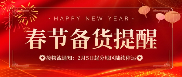 您好!新春將至,謹(jǐn)代表我司全體同仁,預(yù)祝您新春愉快、萬(wàn)事順?biāo)臁?br />感謝您長(zhǎng)期以來(lái)的支持與信任,F(xiàn)有一則關(guān)于春節(jié)物流安排的重要通知,敬請(qǐng)您知悉,以便提前做好生產(chǎn)安排。
