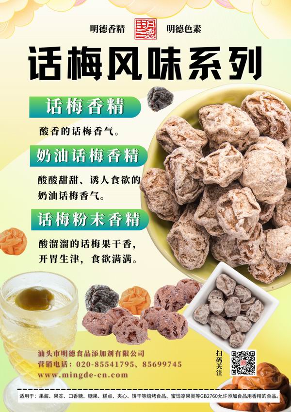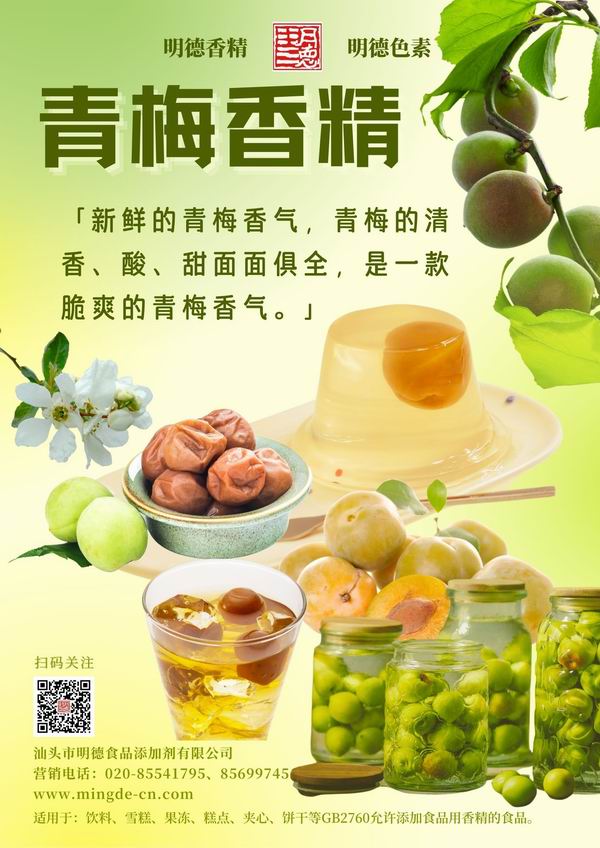 在梅子風味香精領域我們數十年潛心專研,迎合市場需求,滿足消費者喜好,汕頭市明德食品添加劑有限公司,推出了多種款梅子風味香精,如:青梅風味、酸梅風味、話梅風味、酸梅湯風味等。