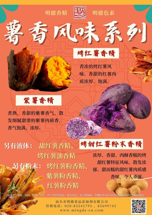 在薯味香精領(lǐng)域我們數(shù)十年潛心專研,迎合市場需求,滿足消費者喜好,汕頭市明德食品添加劑有限公司,推出了多種風味的番薯風味香精,如:紫薯香精、紅薯香精、烤紫薯香精、烤紅薯香精、甜紅薯香精等。
