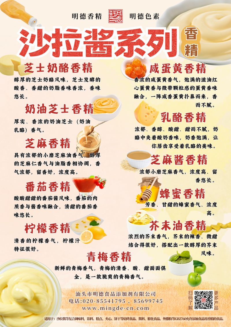 明德沙拉醬系列香精 多樣沙拉醬風(fēng)味 適配多類食品工廠汕頭市明德食品添加劑有限公司推出的沙拉醬系列香精,涵蓋芝士、蛋黃、芝麻、果蔬及特色風(fēng)味,適用于調(diào)味醬、焙烤制品、休閑食品等多個(gè)工業(yè)應(yīng)用場景,助力B端工廠實(shí)現(xiàn)風(fēng)味的穩(wěn)定性與差異化,讓產(chǎn)品在市場中脫穎而出。