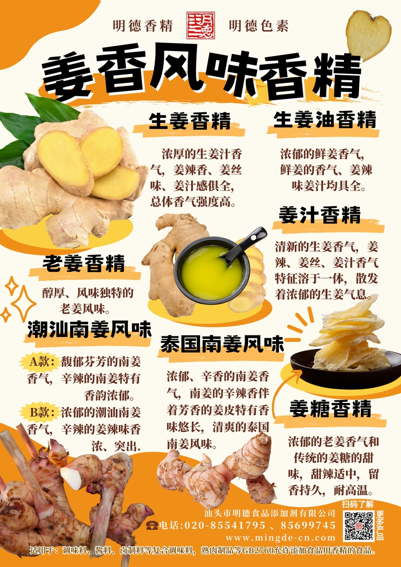 明德姜香風(fēng)味香精 姜之本味 層次盡顯汕頭市明德食品添加劑有限公司推出的姜香風(fēng)味香精系列,覆蓋生姜、姜汁、生姜油、老姜、潮汕南姜、泰國南姜等多種調(diào)性。產(chǎn)品風(fēng)味真實,留香穩(wěn)定,適用于醬料、腌制料、調(diào)理食品、肉制品、風(fēng)味飲品、糖果、烘焙及外撒粉等B端應(yīng)用,幫助工廠穩(wěn)定呈現(xiàn)鮮明的姜辣香與去腥提鮮效果。